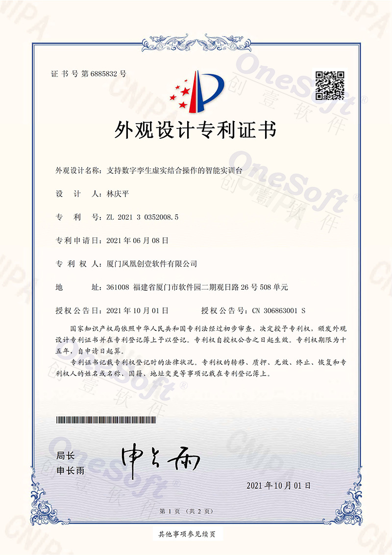 鳳凰創(chuàng)壹智能實驗臺 (外觀設計專利證書)