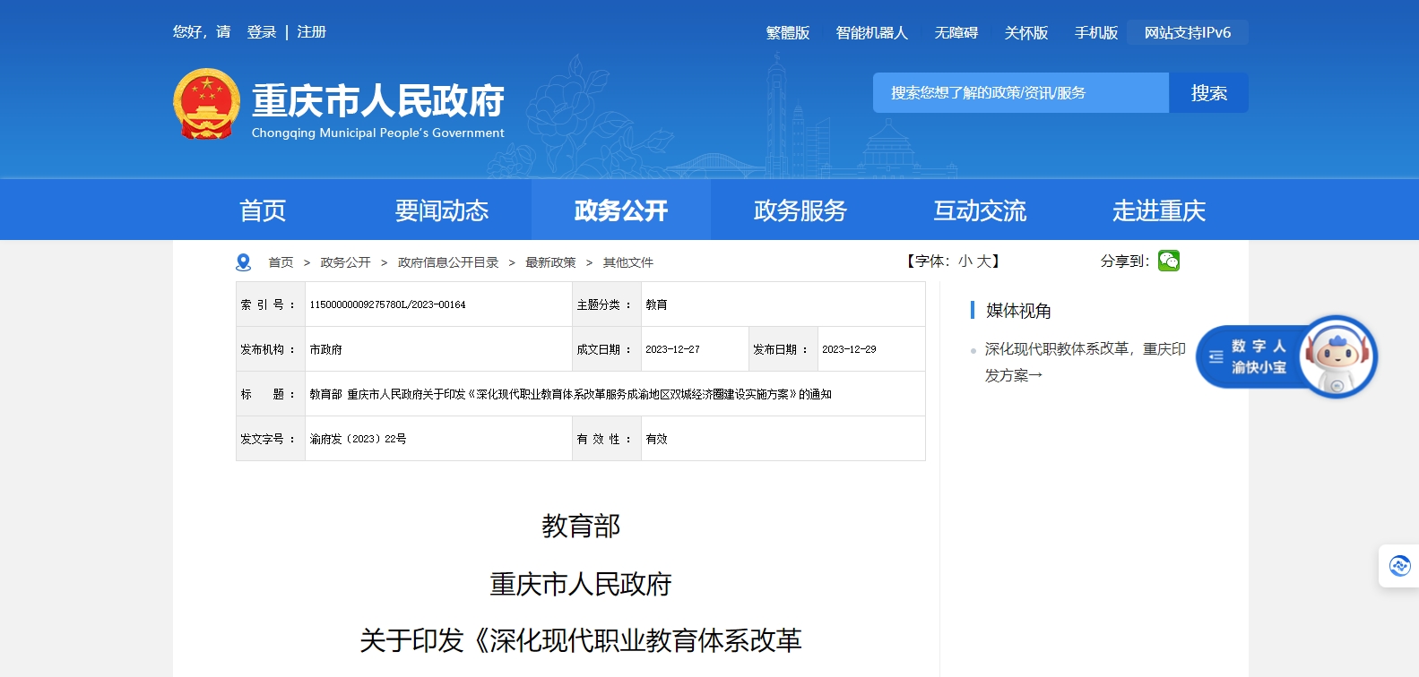 近日,重慶市人民政府官網(wǎng)發(fā)布教育部 重慶市人民政府 關(guān)于印發(fā)《深化現(xiàn)代職業(yè)教育體系改革 服務(wù)成渝地區(qū)雙城經(jīng)濟(jì)圈建設(shè)實(shí)施方案》的通知,通知中明確實(shí)施職業(yè)教育數(shù)字化行動(dòng),做大做強(qiáng)重慶智慧教育平臺(tái),建設(shè)國家級(jí)職業(yè)教育在線精品課程100門左右、規(guī)劃教材300種左右、專業(yè)教學(xué)資源庫10個(gè)左右、虛擬仿真實(shí)訓(xùn)基地15個(gè)左右。實(shí)施教師能力提升行動(dòng),教育部支持重慶市承辦全國職業(yè)院校技能大賽教學(xué)能力比賽和德育與思想政治教育有關(guān)賽項(xiàng),建設(shè)一批“雙師型”教師培養(yǎng)培訓(xùn)基地、教師教學(xué)創(chuàng)新團(tuán)隊(duì)、教師企業(yè)實(shí)踐基地和示范性教師企業(yè)實(shí)踐流動(dòng)站,推動(dòng)企業(yè)工程技術(shù)人員、高技能人才和職業(yè)學(xué)校教師雙向流動(dòng)。實(shí)施終身學(xué)習(xí)質(zhì)量提升行動(dòng),推進(jìn)成渝地區(qū)雙城經(jīng)濟(jì)圈學(xué)分銀行建設(shè),開展多種形式的職業(yè)教育資格資歷互認(rèn),建設(shè)一批示范性職工培訓(xùn)基地,打造一批職業(yè)學(xué)校老年教育、社區(qū)教育示范基地。