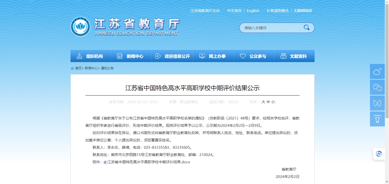 近日,江蘇省教育廳在其官方公布中國特色高水平高職學(xué)校中期評價(jià)結(jié)果公示,通知全文如下:
