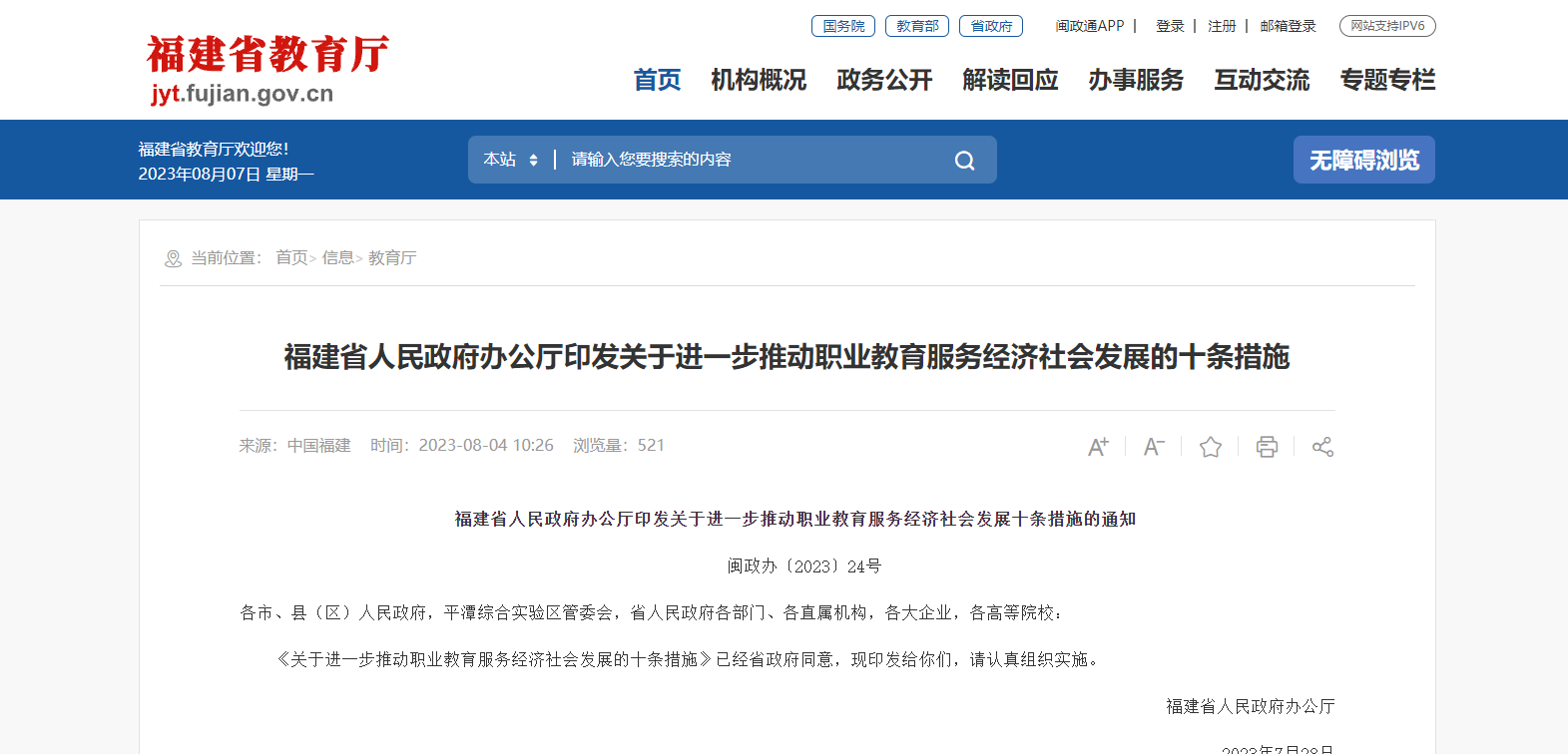 福建省人民政府辦公廳印發(fā)關(guān)于進一步推動職業(yè)教育服務(wù)經(jīng)濟社會發(fā)展的十條措施