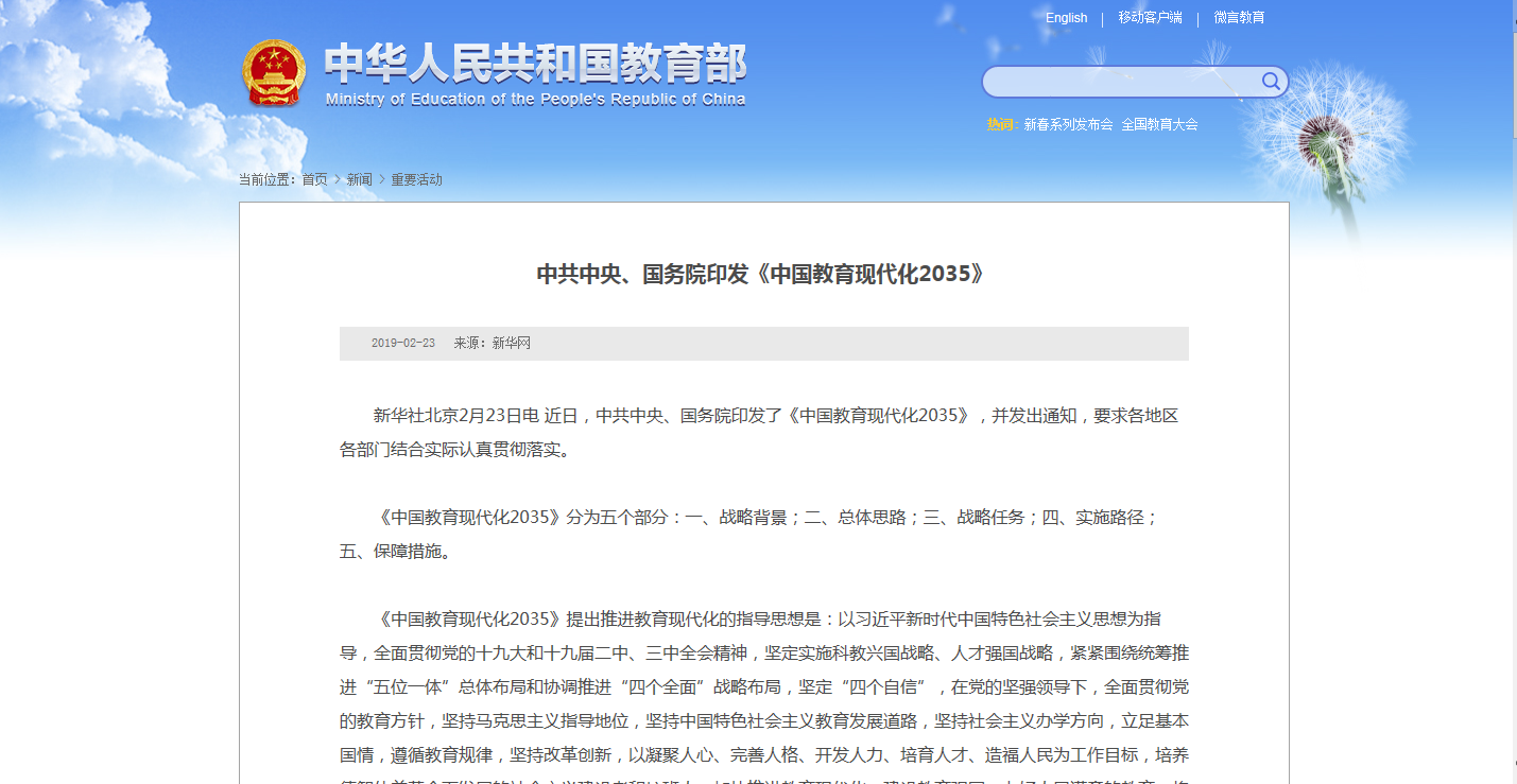 近日,中共中央、國(guó)務(wù)院印發(fā)了《中國(guó)教育現(xiàn)代化2035》,其中提到2035年主要發(fā)展目標(biāo)是:建成服務(wù)全民終身學(xué)習(xí)的現(xiàn)代教育體系、普及有質(zhì)量的學(xué)前教育、實(shí)現(xiàn)優(yōu)質(zhì)均衡的義務(wù)教育、全面普及高中階段教育、職業(yè)教......